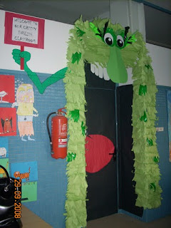 This is our classroom door, there’s a banner that says “Welcome to our creepy English classroom” and this is Creepy, our special moster